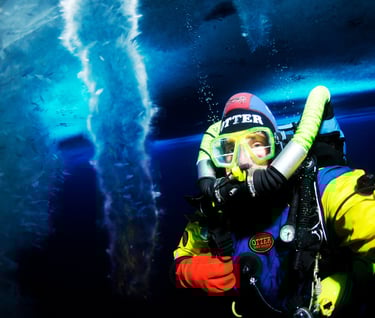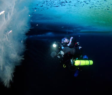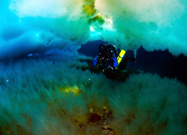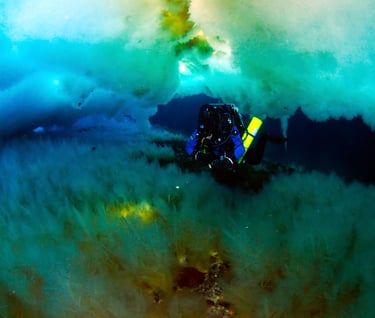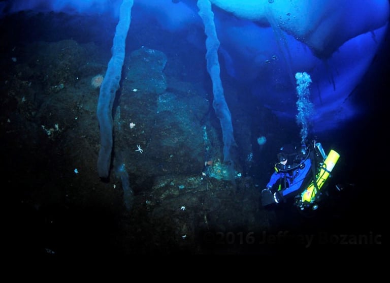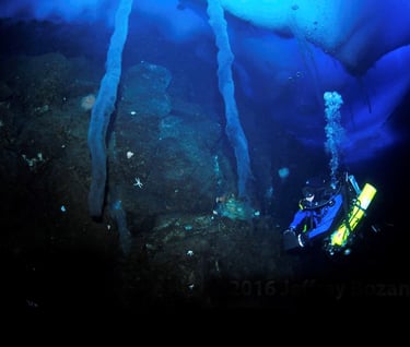 I can feel ice crystals hitting my teeth as I inhale. They are small and insignificant, but deeper inside the mouthpiece, vibration and a rattling sound warn of larger ice fragments in the breathing hoses and mouthpiece chamber. I wonder if they will cause more serious issues than the slight inconvenience of the crystals that strike my teeth as I gaze at a row of ice stalactites 400 feet away. To ease my concern, I fin closer to the hole that leads to the surface, marveling at the vista surrounding me under Antarctica’s ice-shrouded ocean.