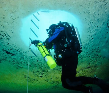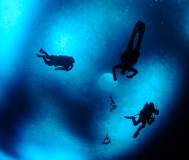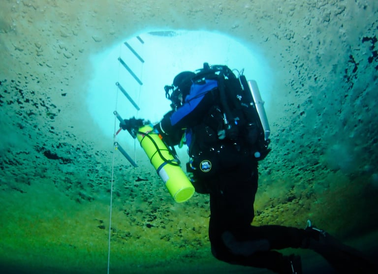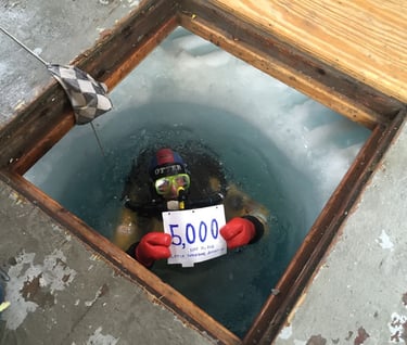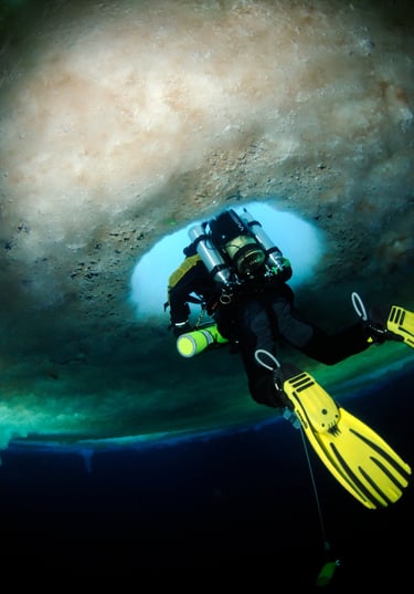 Our dives begin by descending through a vertical shaft 4 feet in diameter, a hole in the ice drilled from the surface using a giant auger.