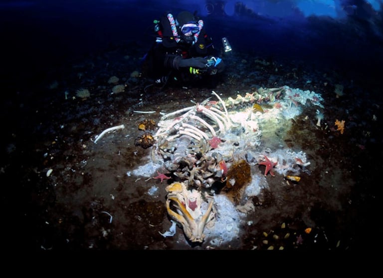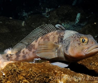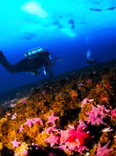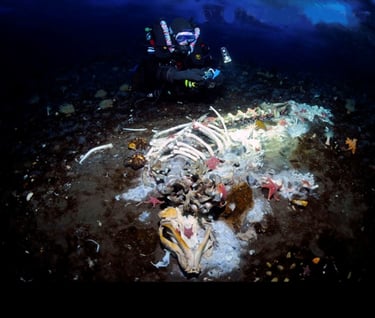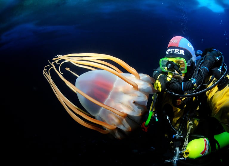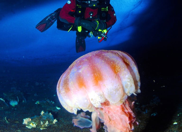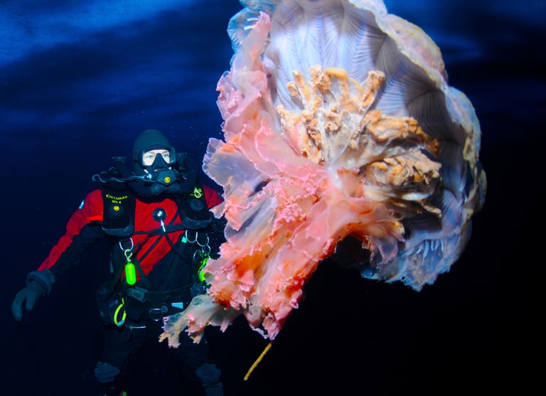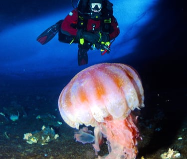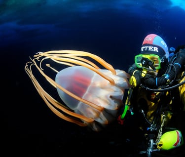 We share the water column with various nektonic organisms. Brightly colored multihued jellyfish drift past, many much larger than my head. Some are large enough to be seen from hundreds of feet away. Many carry hitchhikers, small amphipods that ride on their backs to evade predators. Other jellies have tentacles that extend more than 20 feet to ensure they can acquire the food they need to live here.