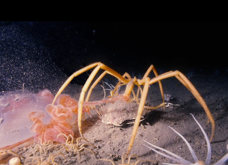 Gigantism is common here. Some of the pycnogonids (sea spiders) are wider than my outstretched hand. The largest of these I have seen elsewhere is maybe a quarter-inch. Giant four-inch-long isopods crawl on the bottom, and usually microscopic foraminifera can be easily seen here with the naked eye. It is almost as if these animals came from an H. G. Wells novel. It is thought that the animals here may grow larger due to the cold water, slower metabolisms and a reduced need to evade predators.