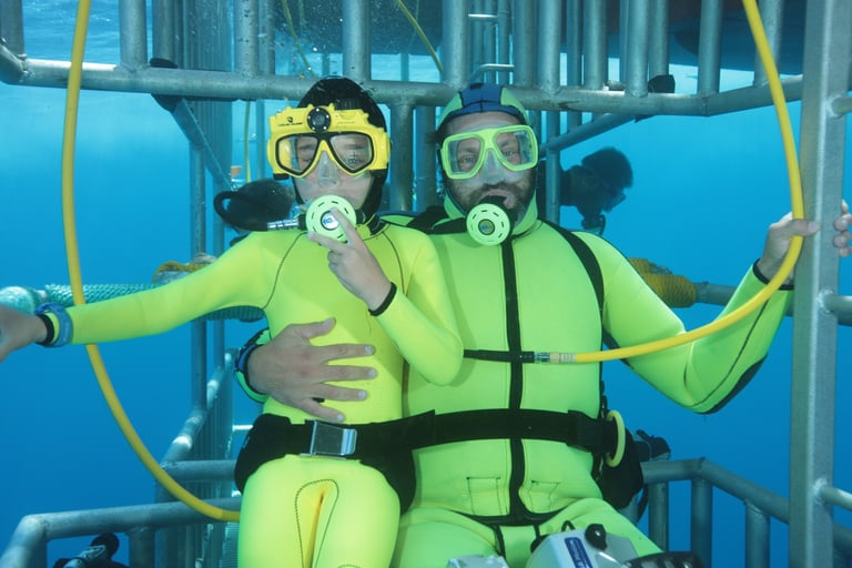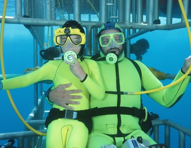 I have bought suits for my wife and all of my kids from them. Here is a photo of my son, John-Aaron, and me in the shark cage at Guadalupe Island (Mexico) aboard the Nautilus Explorer.