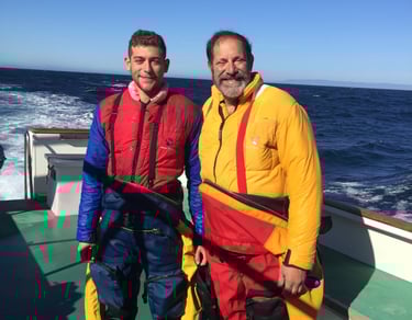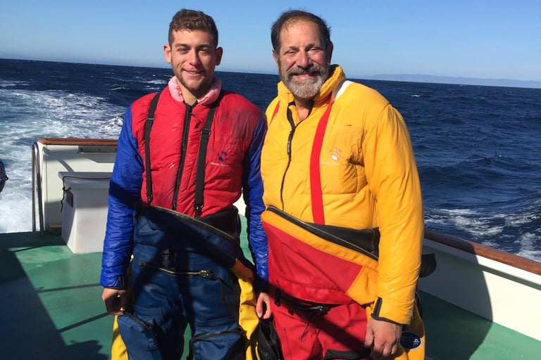 This picture is taken with Evan (in his Weezle suit) near Santa Cruz Island, offshore of Santa Barbara, CA, where we were exploring and mapping underwater caves.